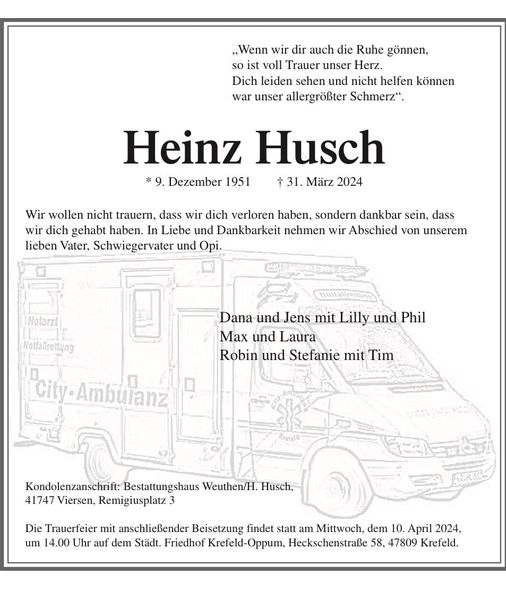 Hintergrund weiter!!! Die 19218 Rettungsdienst ist nicht nur in Krefeld. Sondern auch in Hamburg Leipzig München und Rosenheim vertreten. Im Umgehrungschluss hätte Stadt Krefeld für eine Unterstützung geworben. Die hat die Stadt Krefeld nicht gemacht, sondern über über eine Nacht und Nebel Aktion die 19218 Rettungsdienst aus dem Verkehr gezogen hat. So dass Leute sterben mussten. 25 Rettungsfahrzeuge auf einmal weck zu haben geht Nicht. Gez. P. Borkmann Erstellt am : 14.10.2023 |